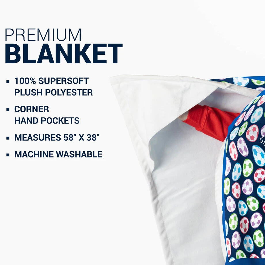 This 58 x 38″ plush premium soccer blanket wrap is densely woven, luxuriously soft and perfect to wrap yourself in after a demanding practice or game. With corner hand pockets, you won’t need to worry about this blanket falling off when you are cheering on your team from the sidelines or just cozied up on the couch. Pro tip, take it to the beach or use it as a picnic blanket and add weighted items to the corner pockets to keep it from blowing away. Our premium blankets make for a great gift idea for any occasion, cause who doesn’t love the gift of warmth!