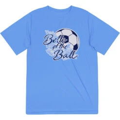 You are the belle of the ball, so let everyone know it in this soccer themed athletic tech tee! Designed to perform, our short sleeve performance t-shirts are made from 100% moisture-wicking polyester interlock with UV protection to keep athletes cool and dry. With a relaxed and easy fit, they make for a great tee for both on and off the soccer field. Personalize these tees by adding your team number to the back. These make for a winning gift idea for any occasion for both players and fans!