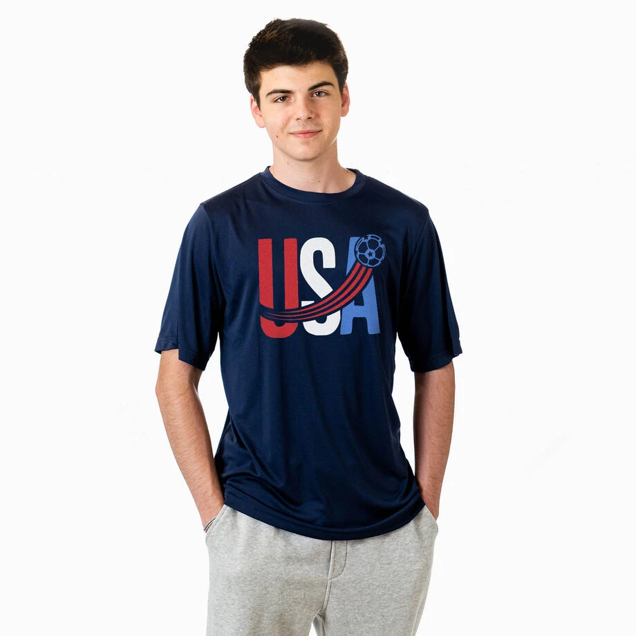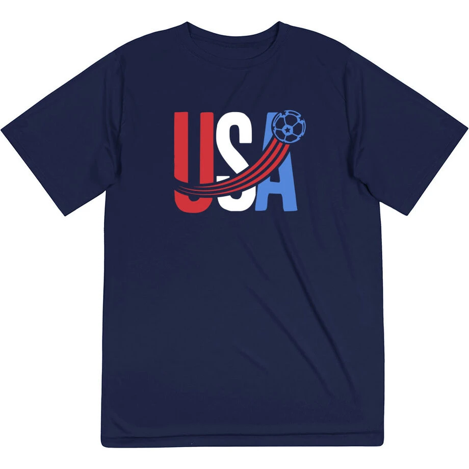 Rep that red, white and blue pride in our USA Patriotic soccer themed athletic tech tee, perfect for the 4th of July! Designed to perform, our short sleeve performance t-shirts are made from 100% moisture-wicking polyester interlock with UV protection to keep athletes cool and dry. With a relaxed and easy fit, they make for a great tee for both on and off the soccer field. Personalize these tees by adding your team number to the back. These make for a winning gift idea for any occasion for both players and fans!