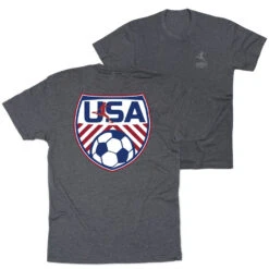Wear your favorite patriotic soccer design on the BACK of your shirt with a smaller design on the front. Show off your soccer pride with this bold and stylized short sleeve t-shirt. It’s a great soccer gift idea for any player who just can’t get enough of that ultimate sport lifestyle. It makes for the perfect end of season gift or any special occasion. Coming in a variety of colors and unique designs these are a great wardrobe collection.