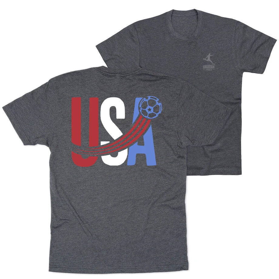 Wear your favorite patriotic soccer design on the BACK of your shirt with a smaller design on the front. Show off your soccer pride with this bold and stylized short sleeve t-shirt. It’s a great soccer gift idea for any player who just can’t get enough of that ultimate sport lifestyle. It makes for the perfect end of season gift or any special occasion. Coming in a variety of colors and unique designs these are a great wardrobe collection.
