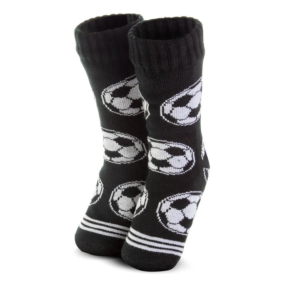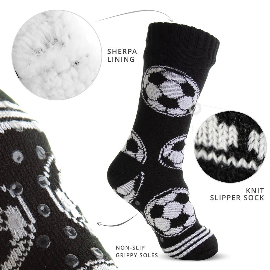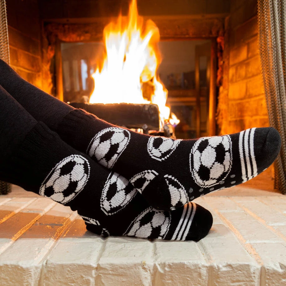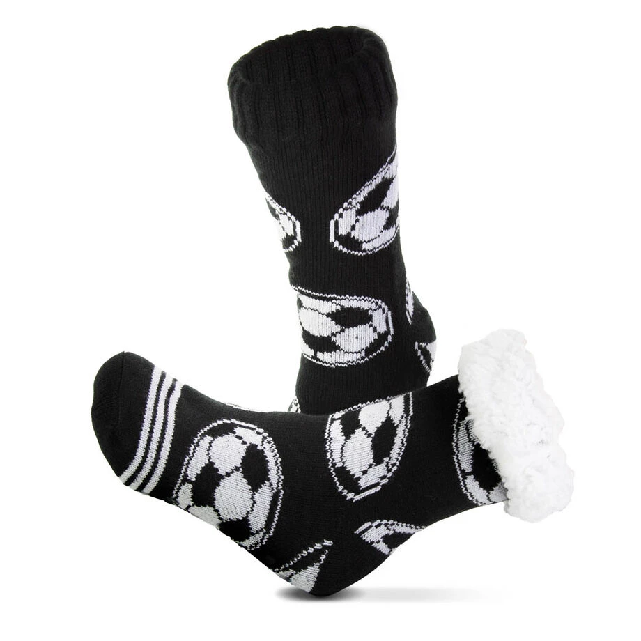 Our soccer slipper socks have a unique knit pattern and are lined with sherpa fleece for a thick and cozy pair of slipper socks you’ll wear all winter long. These awesome socks are cushioned and warm and help comfort and rest tired feet while keeping them warm. The bottoms have silicon dots for safety – no worries about slipping! One size fits most.
