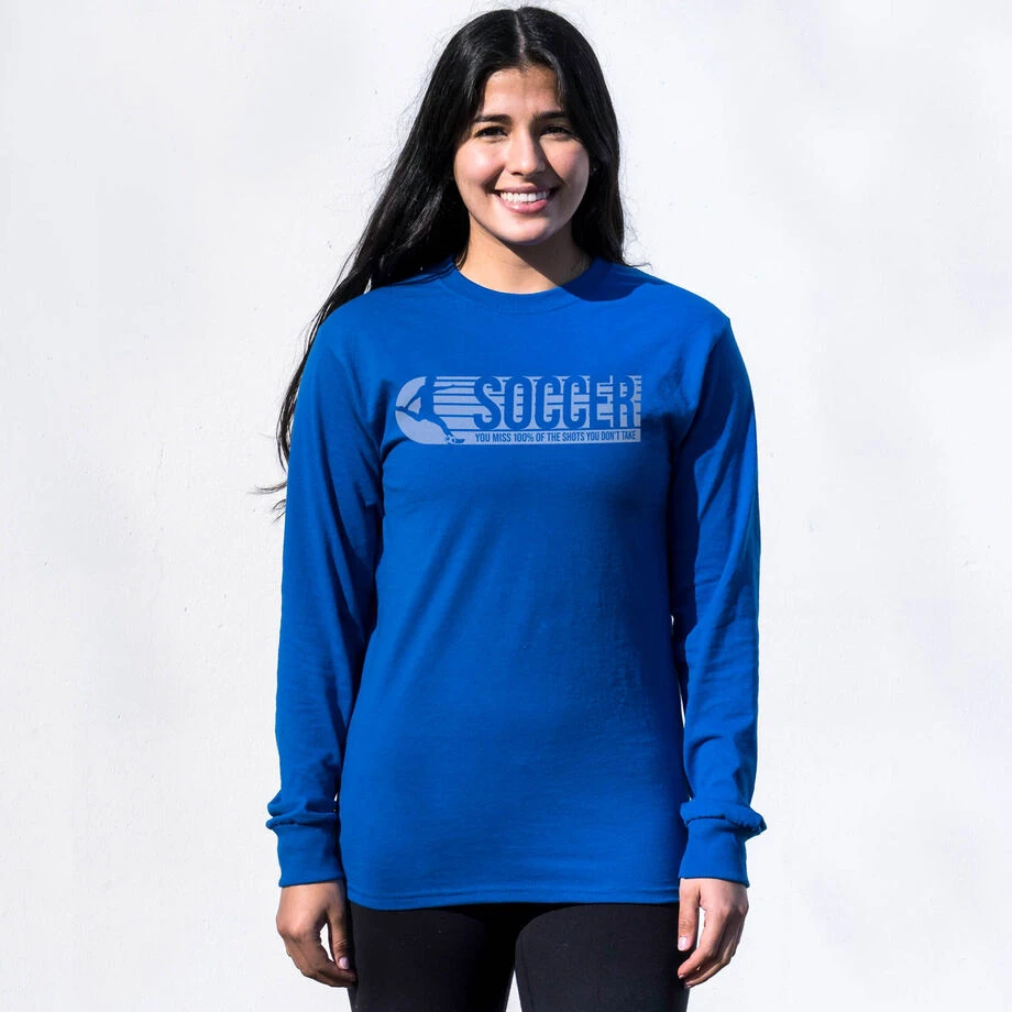 Show off your soccer pride with this bold and stylized long sleeve soccer shirt. It’s a great gift idea for anyone who just can’t get enough of that soccer lifestyle. It makes for the perfect end of season gift or any special occasion. Coming in a variety of colors and designs these long sleeve shirts are a great wardrobe collection. Even get them personalized with your # on the back!