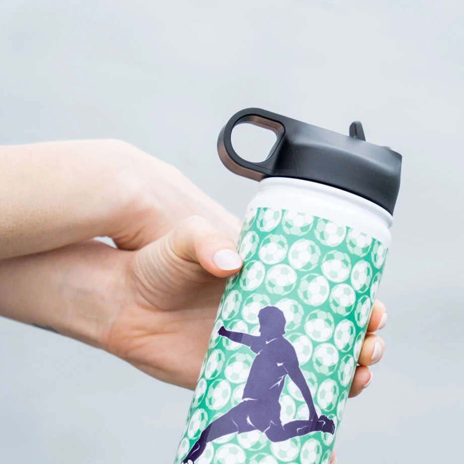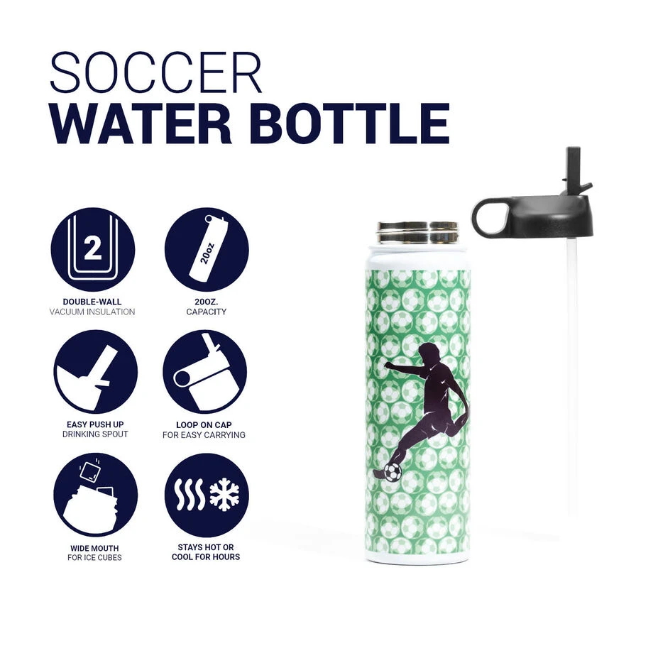Our stainless steel water bottle features one-of-a-kind Guy Soccer Player design. The 20oz double vacuum insulated tumbler is the perfect choice to retain freshness and keep any beverage at its optimal temperature for an extended period of time. Our stainless steel water bottle offers an easy push up drinking spout with straw, wide mouth for ice cubes, as well as a loop on the cap for easy carrying. This unique water bottle makes for a great gift for any soccer player who is always on-the-go.