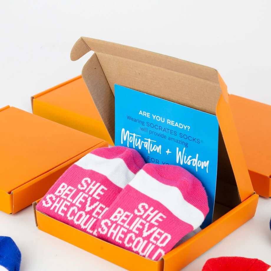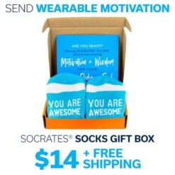 Want to send more than a card? Send a pair of motivational socks to a friend, Mom, Dad, son, daughter, etc. to show how much they mean to you. Socrates® socks provides wisdom and motivation not only for your feet but also for the body and soul. These high quality performance socks are designed with arch support and cushioning to pad the contours of your feet.