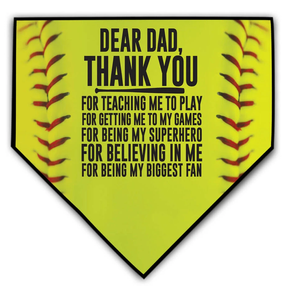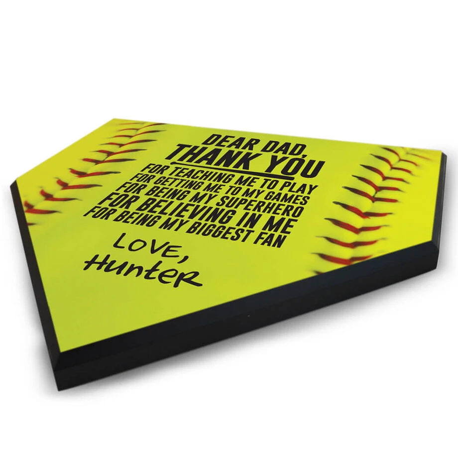 Our softball 10″ X 10″ wood home plate plaque is sure to make a great gift for Dad and by adding your own personal touch it will be cherished for years. This lightweight wood plaque is easy to hang with a single screw for any eye catching display for any room of a home or office. Make your home plate plaque even more unique with adding your very own special touch with permanent marker.