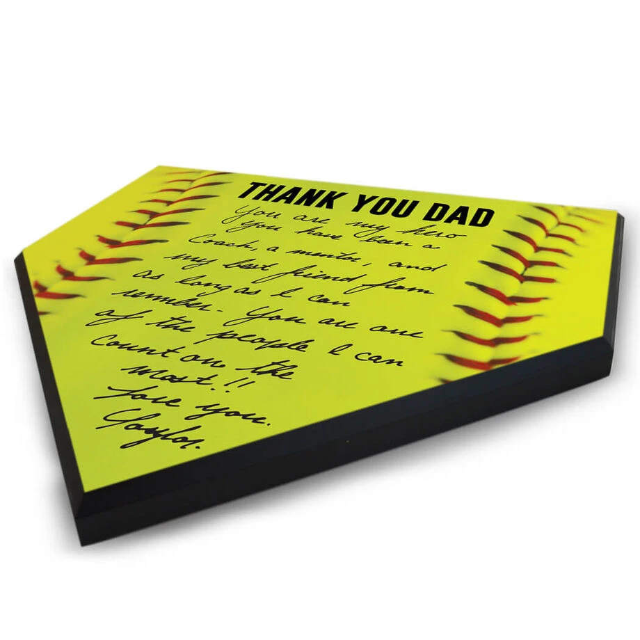 Our softball 10″ X 10″ wood home plate plaque is sure to make a great gift for Dad and by adding your own personal touch it will be cherished for years. This lightweight wood plaque is easy to hang with a single screw for any eye catching display for any room of a home or office. Make your home plate plaque even more unique with adding your very own special touch with permanent marker.