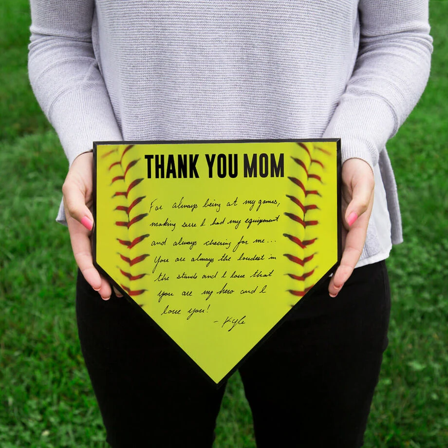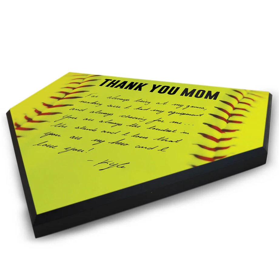 Our softball 10″ X 10″ wood home plate plaque is sure to make a great gift for Mom and by adding your own personal touch it will be cherished for years. This lightweight wood plaque is easy to hang with a single screw for any eye catching display for any room of a home or office. Make your home plate plaque even more unique with adding your very own special touch with permanent marker.