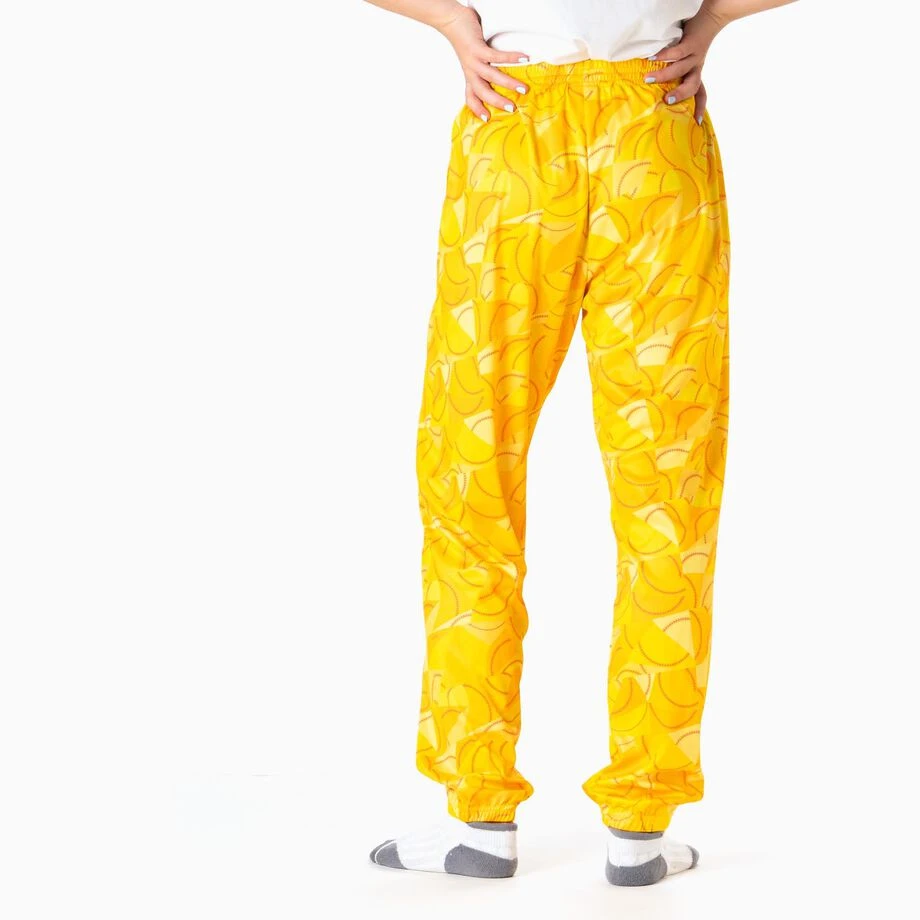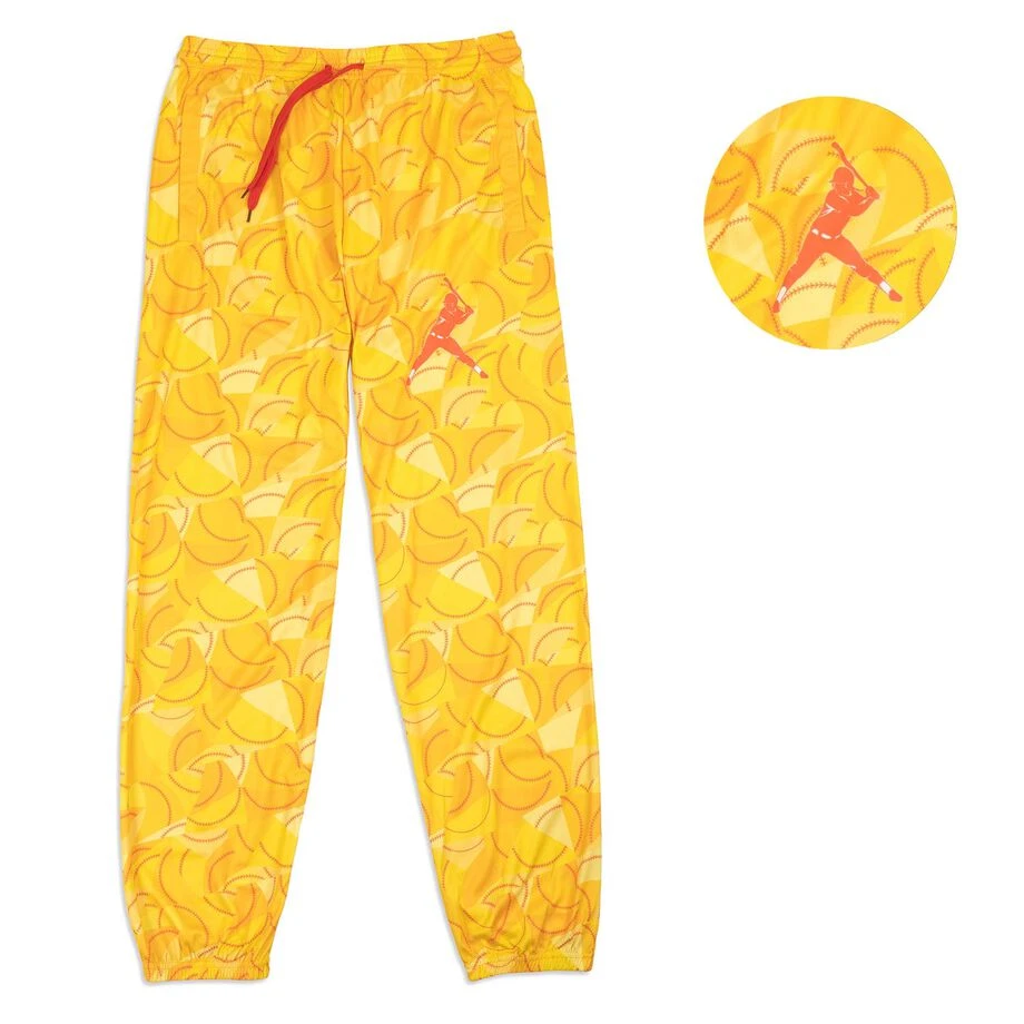 Get comfy in a pair of our softball lounge pants with a fun softball stitches design, whether at home or practicing on the field, these lounge pants are sure to be a hit for all occasions. These lounge pants are made from 100% performance polyester, which makes them great to wear year round. Our lounge pants also feature a comfortable elastic waistband with a drawstring, along with side pockets and elastic ankles. A pair of these lounge pants are a homerun gift for any occasion.