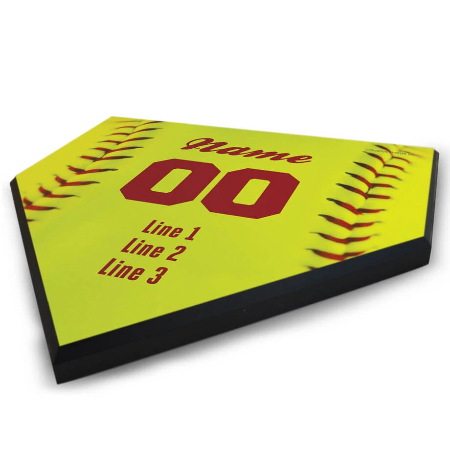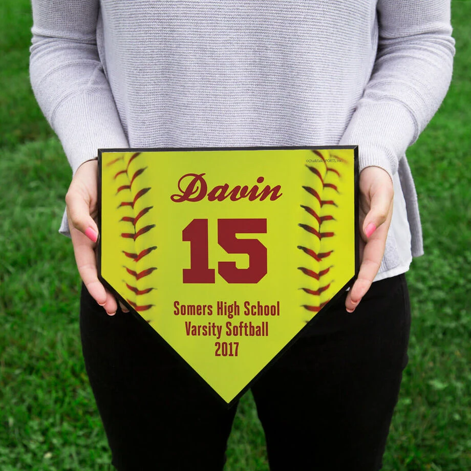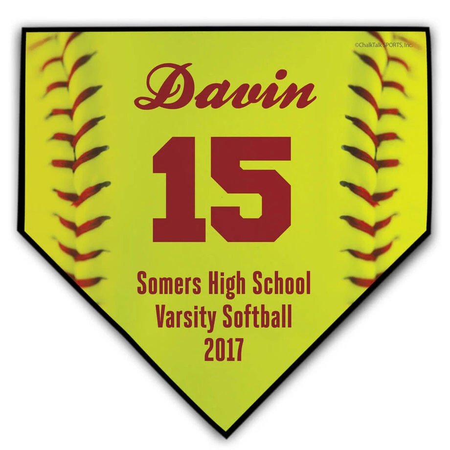 Searching for a great gift the whole softball team will love? Check out this Personalized Softball Stitches Home Plate Plaque! You can add a name, number, and team name to this awesome memento! It makes a great end of season gift for softball players, parents, and coaches alike!
