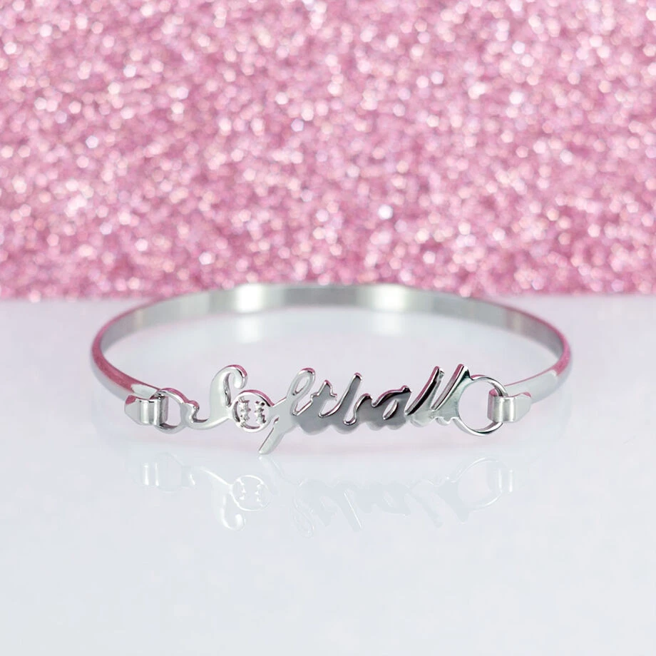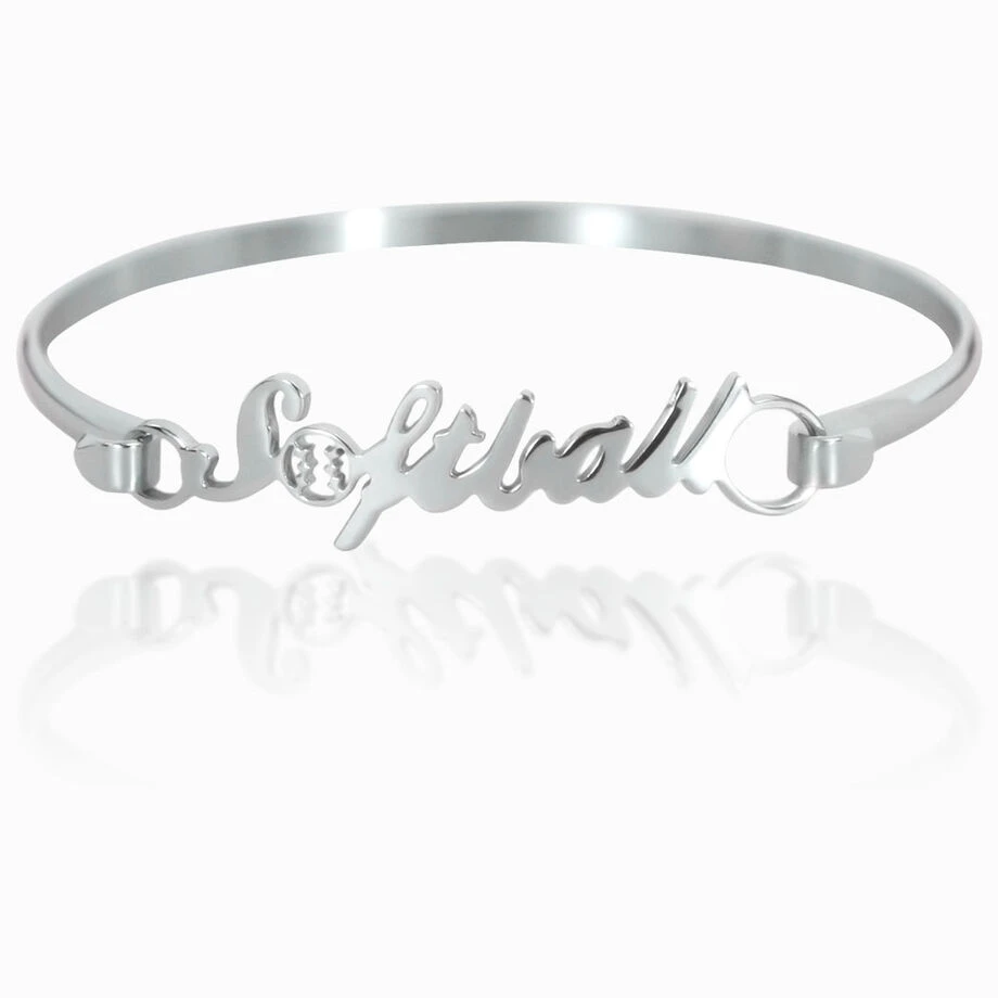 This beautifully designed softball bangle bracelet is sure to be a softball girl’s favorite piece of jewelry. The hook and eye style design makes it easy to put on and take off and it contours to the wrist. Made of stainless steel which is the perfect material for athletes since it is hypo-allergenic, non-reactive and resists scratching.