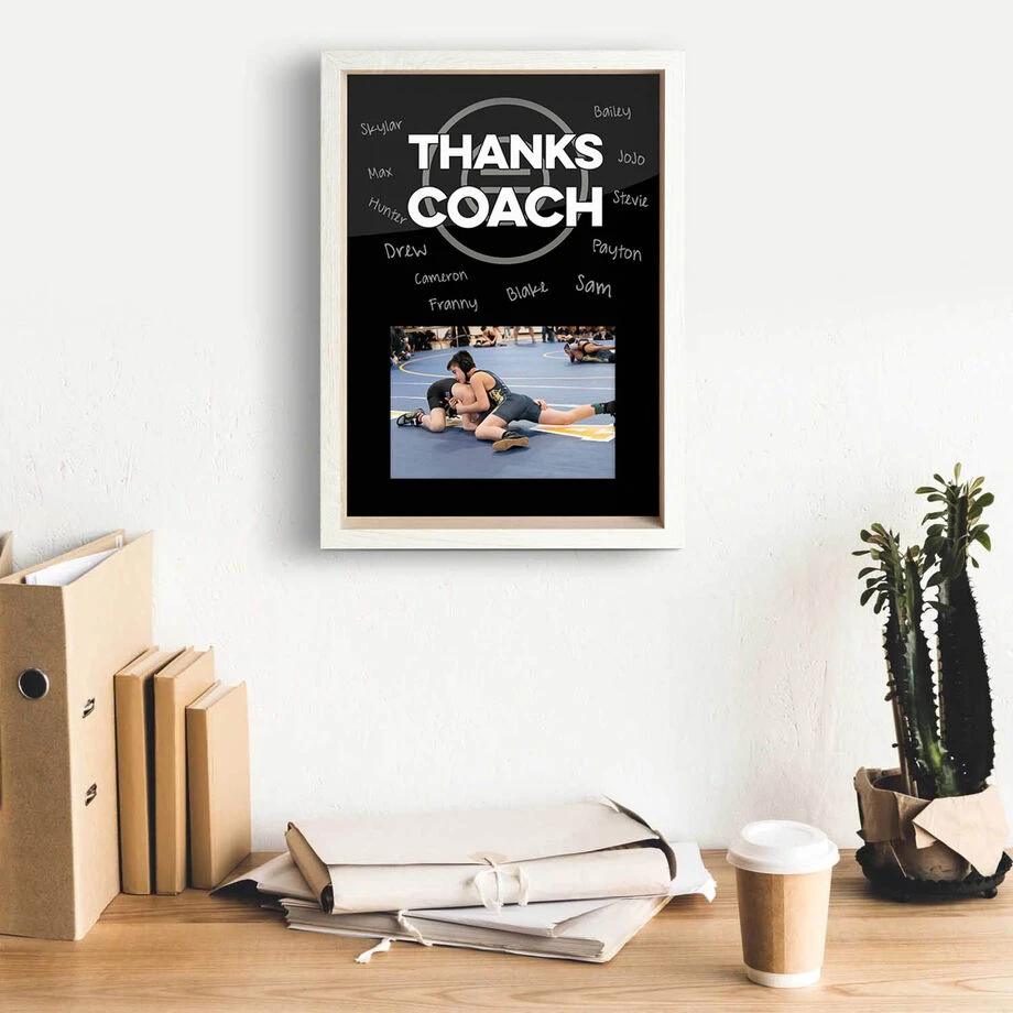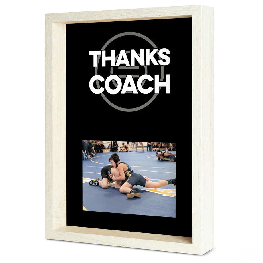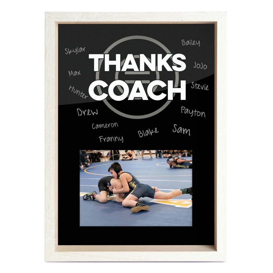 Our Premier Wrestling Thanks Coach Frame features a unique high quality printed wrestling design that compliments any photo, making it the perfect gift for that special coach. Wrestlers will love adding in that extra sentiment to the glass by autographing their names and special messages. This 12″ x 9″ frame will capture that one treasured moment in a horizontal 4″ x 6″ photo. Best of all, you can showcase your frame like a shadow box by displaying it on an office desk or hanging it on a wall. This frame exemplifies all the beauty having a glass cover, durable wood-like resin texture, and an autograph feature to write in your own special touch. This one of a kind frame truly is the best gift you can give and an excellent wrestling keepsake.